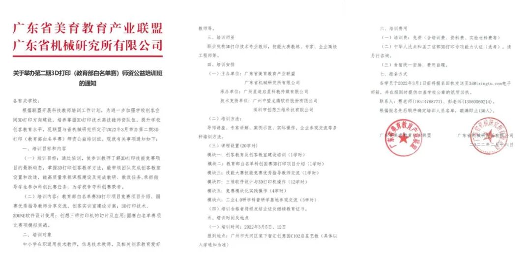 根據(jù)聯(lián)盟開(kāi)展科技教師培訓(xùn)工作計(jì)劃,為進(jìn)一步加強(qiáng)學(xué)校創(chuàng)客空間3D打印方向建設(shè),培養(yǎng)掌握3D打印技術(shù)高技能師資隊(duì)伍,提升學(xué)校創(chuàng)客教育水平,現(xiàn)廣東省美育教育產(chǎn)業(yè)聯(lián)盟與廣東省機(jī)械研究所定于2022年3月舉辦第二期3D 打?。ń逃堪酌麊钨悾熧Y公益培訓(xùn)班。